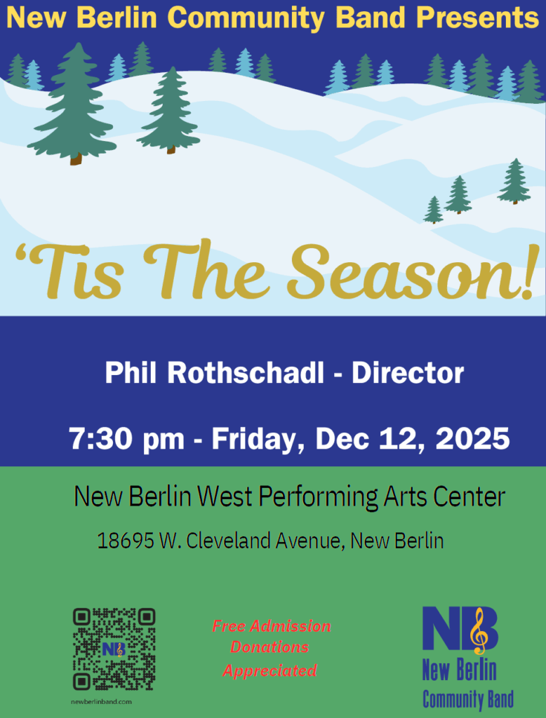 The New Berlin Community Band is a 501(c)3 organization whose mission is to contribute positively to the musical environment in the community through public performances while providing an enjoyable, challenging, and educational musical experience for the members.